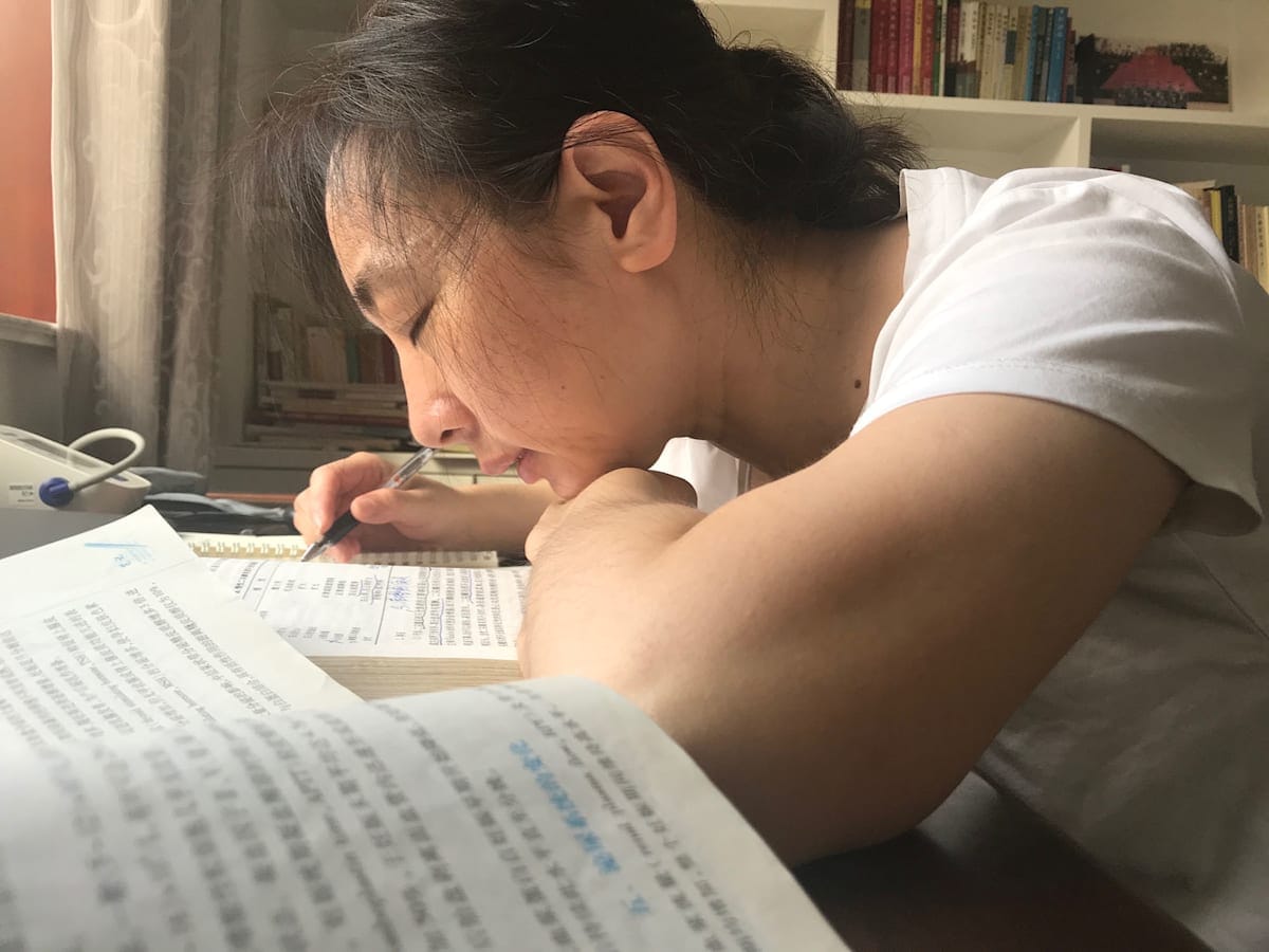 After carefully completing some medical records, she briefly falls asleep on a book out of exhaustion.