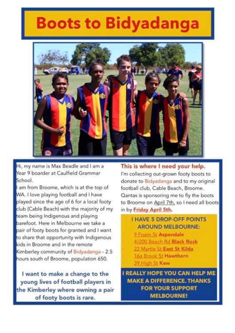 A Caulfield Grammar student has transformed his school project into an interstate community affair with plans to send football boots to the children of Broome. EMMA ANVARI reports.