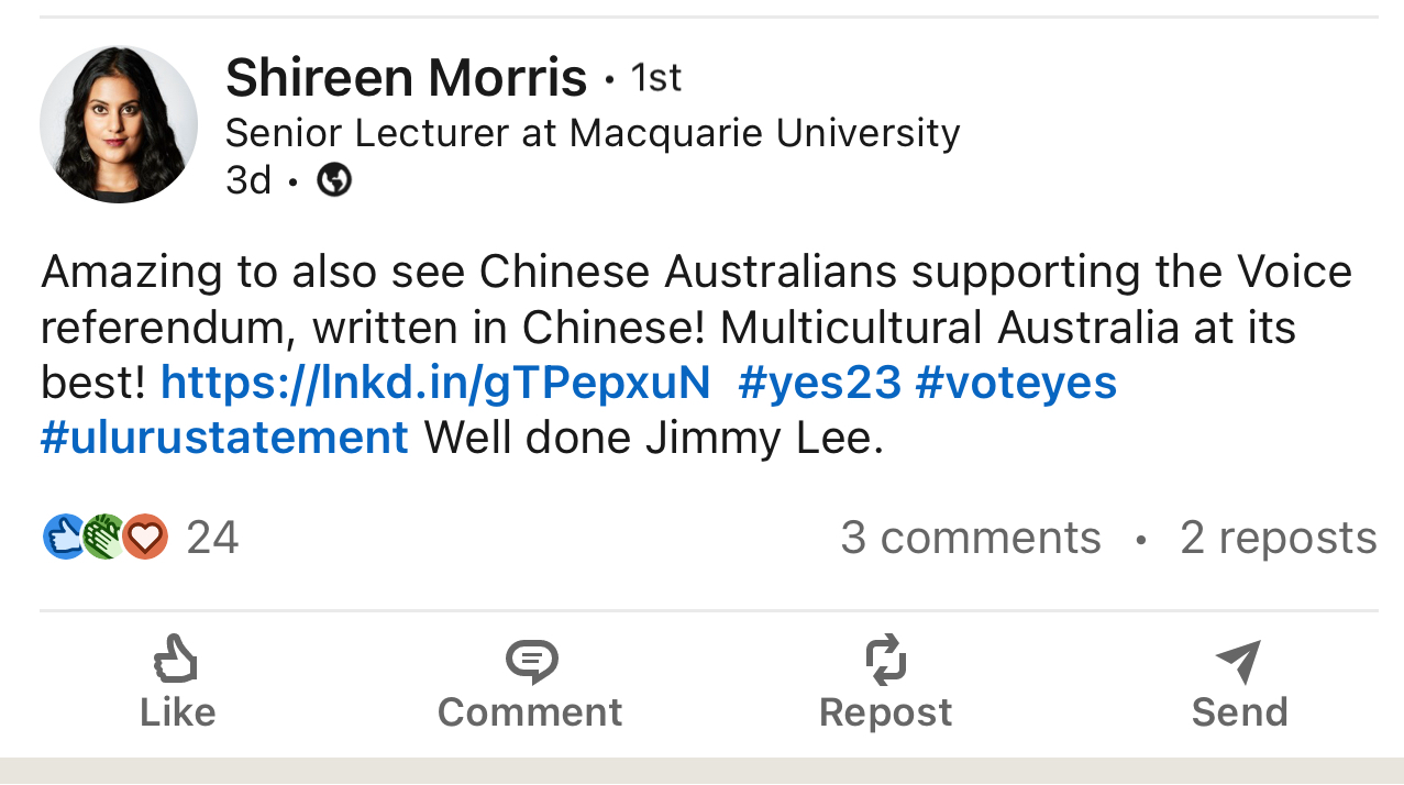 “It is important for the Chinese-Australian community to understand the significance of the Voice referendum in the healing and conciliation process of our country,” Mr Li said.
