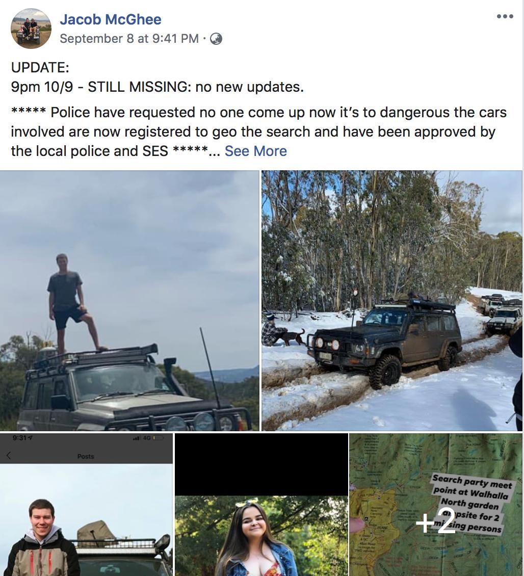 “Police have requested no one come up now it’s to dangerous the cars involved are now registered to (go on) the search and have been approved by the local police and SES,” Mr McGhee wrote in an update to his Facebook post on Tuesday evening.