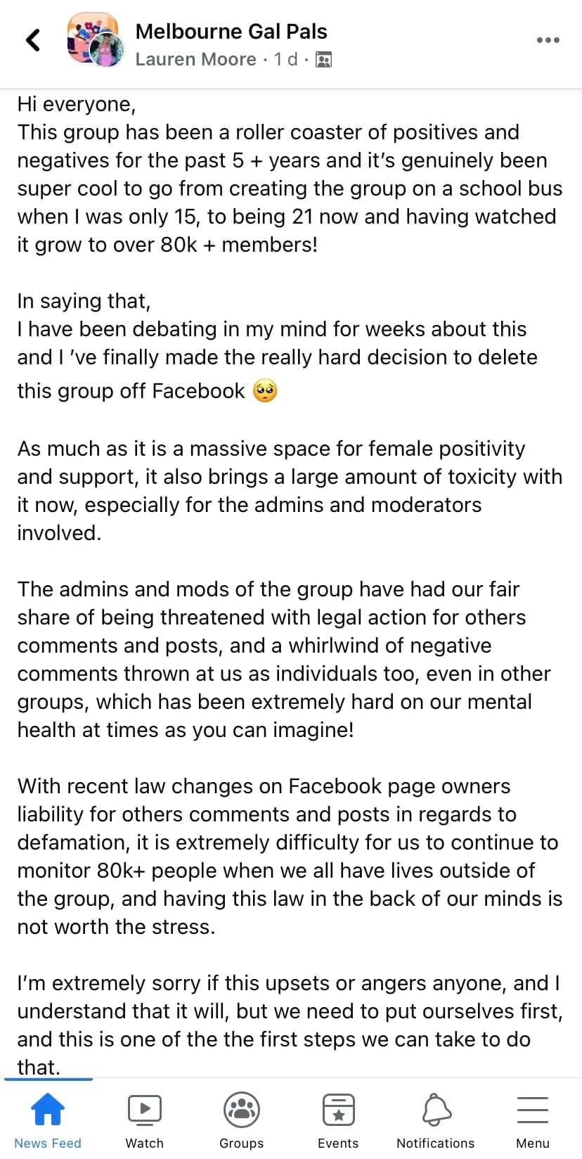 In the wake of this decision, popular Facebook group Melbourne Gal Pals (MGP) was shut down, after the decision made it increasingly difficult for admins to monitor posts made from more than 80,000 group members.