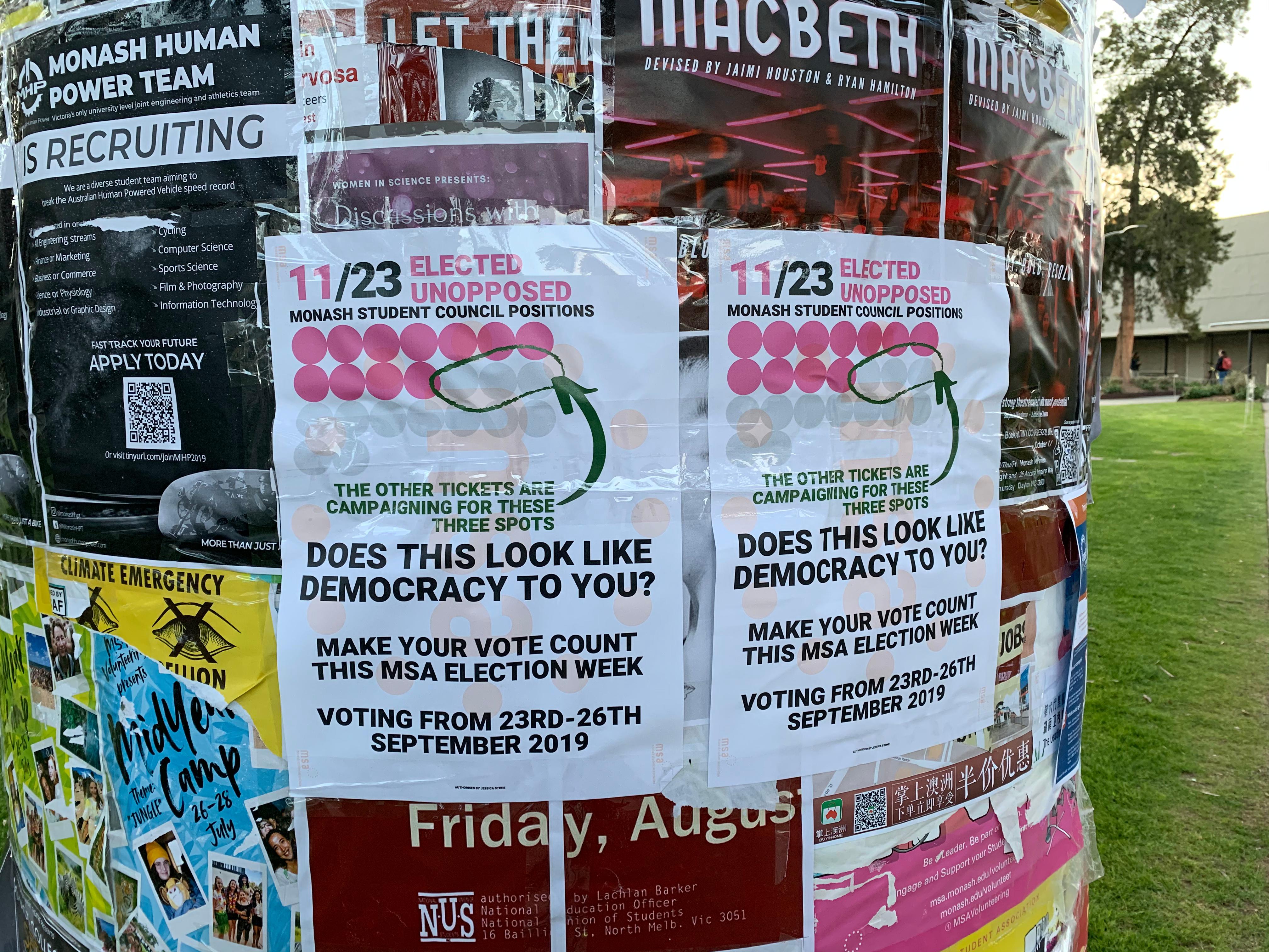 Early last week, she stuck posters around campus to protest Together being elected to 11 Monash Student Council positions unopposed.