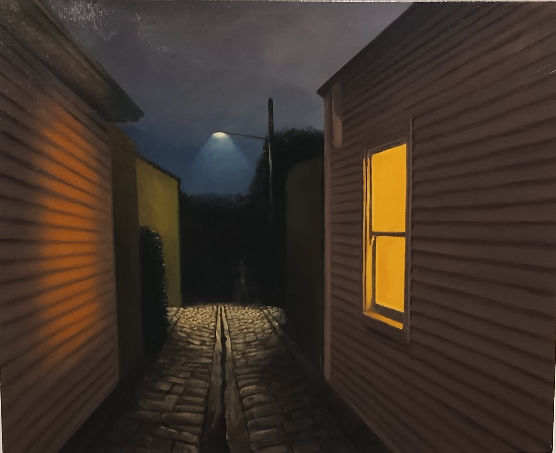 In the painting, a cobbled path leads into a gulf of shadows. It’s a starless evening, and there on the right side is a window, casting the path in muted and soft yellow light.
