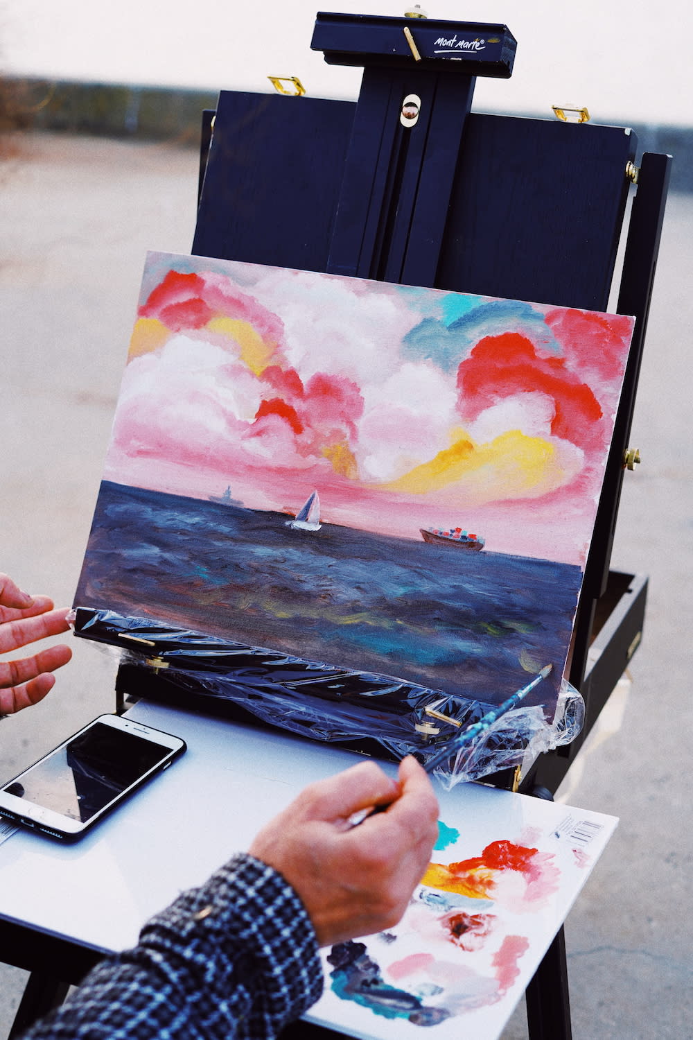 Nima’s paintings are often inspired by real life, whether it be a sailing boat in the distance or passers-by. Here, he is painting the sun set over the sea at St Kilda Beach.