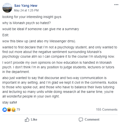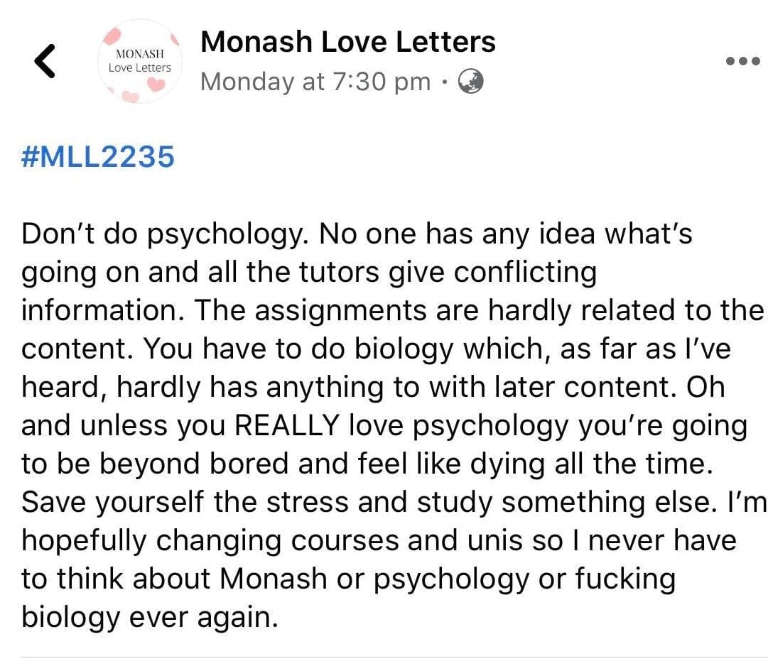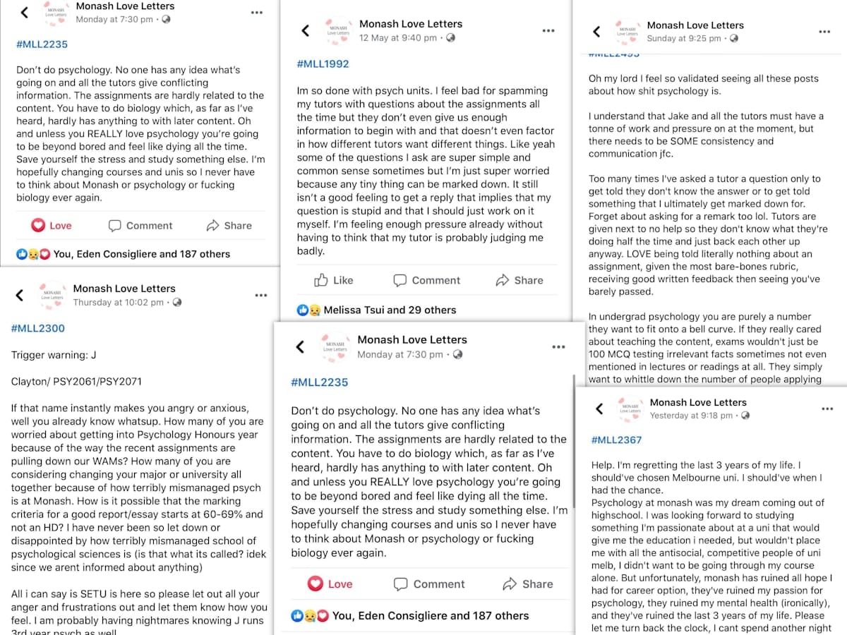 Popular student Facebook groups Monash Love Letters and Monash StalkerSpace have been flooded with complaints by students enrolled in psychology, under the Faculty of Medicine, Nursing and Health Services at Monash University.