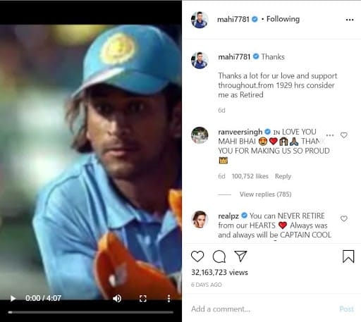 “Thanks a lot for [your] love and support throughout. From 1929 hrs consider me as retired,” Dhoni wrote alongside his Instagram video.