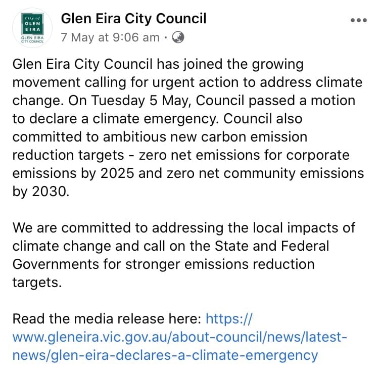 Along with the declaration, the Glen Eira City Council also committed to zero net corporate emissions by 2025, and zero net community emissions by 2030.