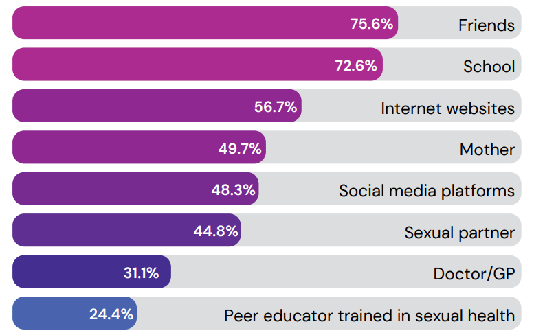 When asked about the sources through which students most commonly received information about sex, peer educators trained in sexual health ranked 8th, behind the internet, social media, friends and school.