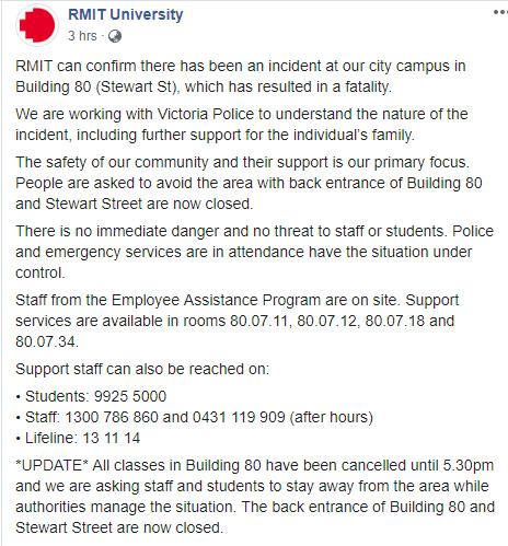 RMIT University posted an official statement on its Facebook page in response to the death.