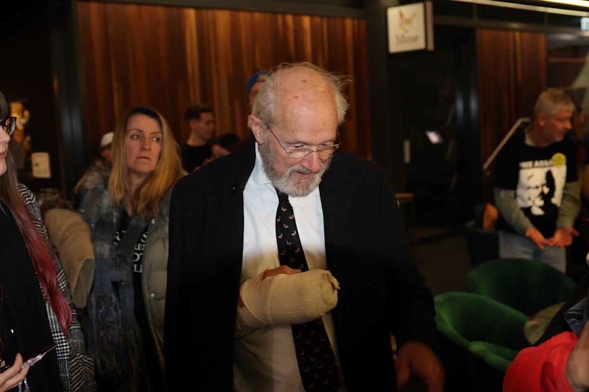 But in the aftermath, as the crowd was dispersing, there remained the figure of a hunched over, bearded man with his right arm in a tight sling. It was John Shipton, the father of Julian Assange.