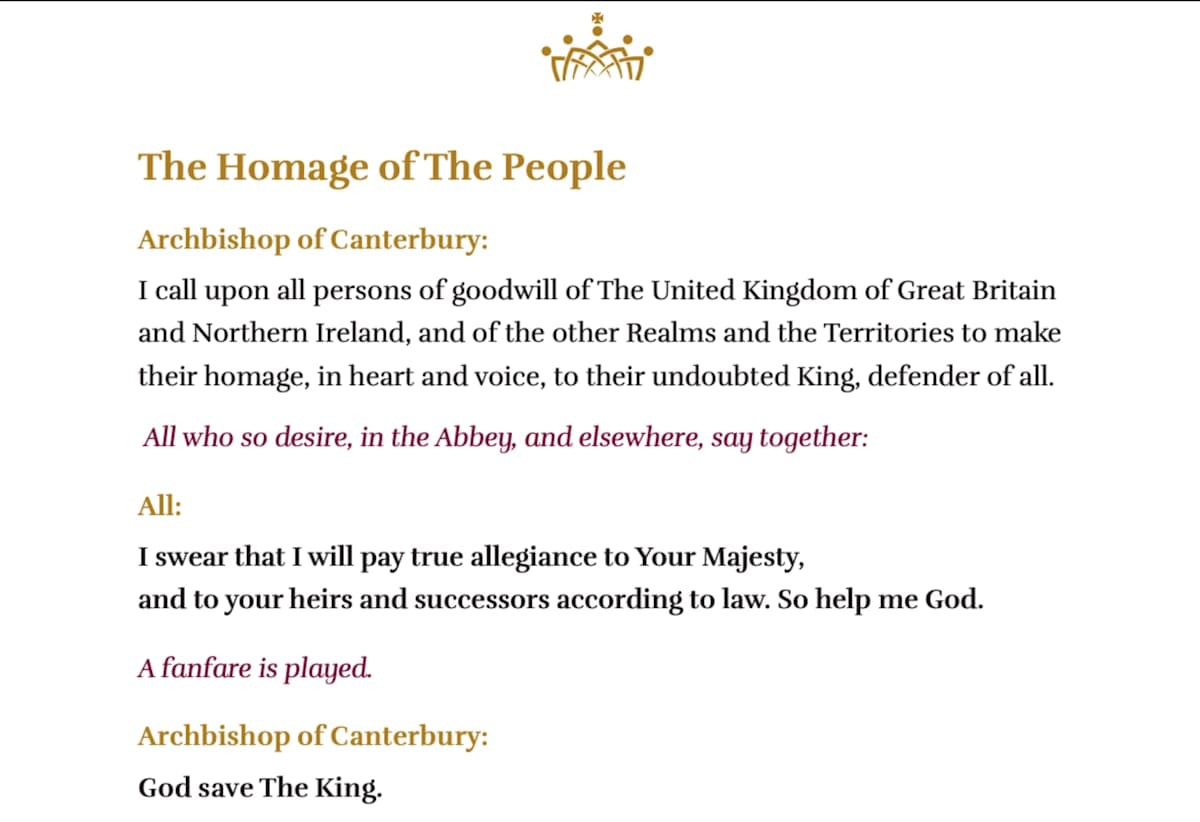 The Archbishop of Canterbury revealed that the liturgy to be used in the coronation will invite those “who so desire, in the Abbey, and elsewhere” to recite "The Homage of The People". The acclamation declares that the people will pledge their loyalty to the King and his successors. This will be echoed at Westminster, where the coronation has taken place for more than 950 years.