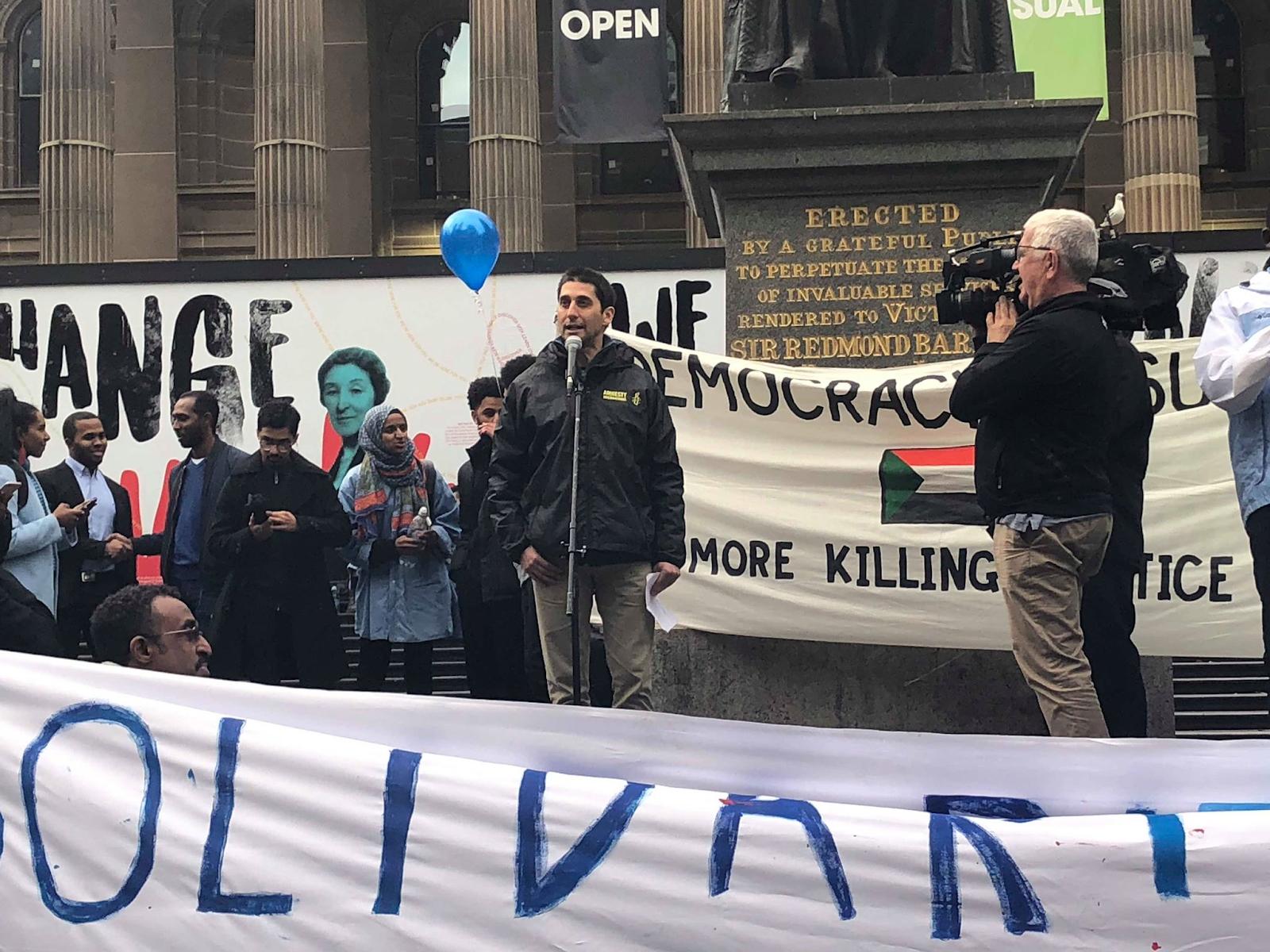 Prior to the march, Amnesty International Australia board director Mario Santos delivered a speech from the steps of the State Library.