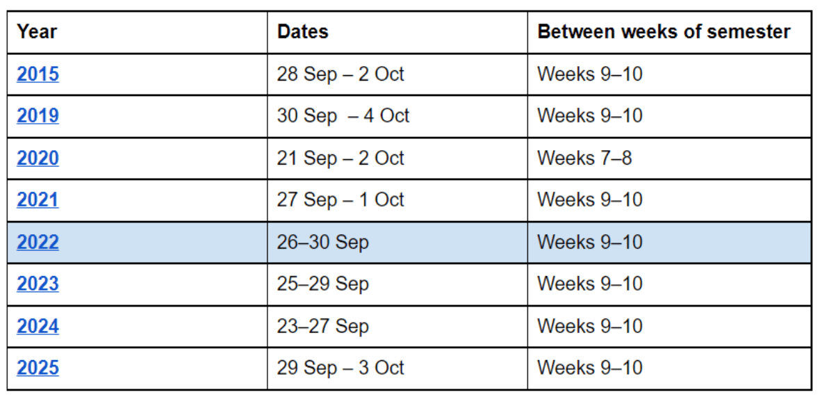 Second semesters have a mid-semester break between weeks nine and 10 except for 2020, when the break was moved due to the pandemic.