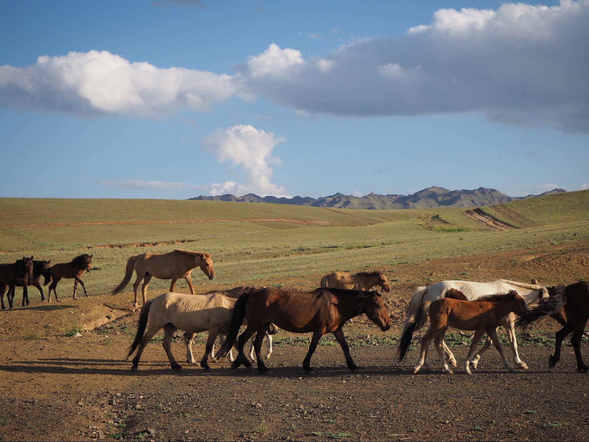 Herds of wild horses gallop in the distance across the plains, and goats, sheep and cattle wander close to the rocky road.