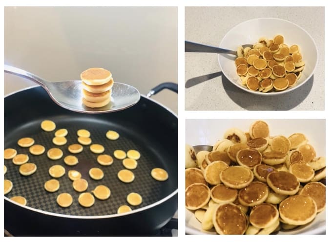 While using a squeeze bottle to pipe the pancakes one by one can be a little tedious, the process is surprisingly satisfying. If you don’t have a squeeze bottle, a ziplock bag with the tip cut off will work just fine.