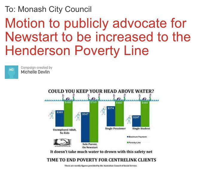 Her campaign was inspired by the Australian Unemployed Workers’ Union (AUWU), which has been encouraging anti-poverty groups to lobby councils to publicly advocate increasing Newstart, together with the Australian Council of Social Service.
