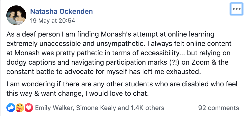“A normal semester was already challenging for me as a deaf student, but online learning has left me drained and unable to access key information,” Ms Ockenden said.