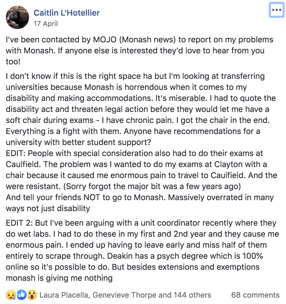“I had floods of people telling me their stories of being treated badly by Monash and then moving to smaller universities and being treated far better.”