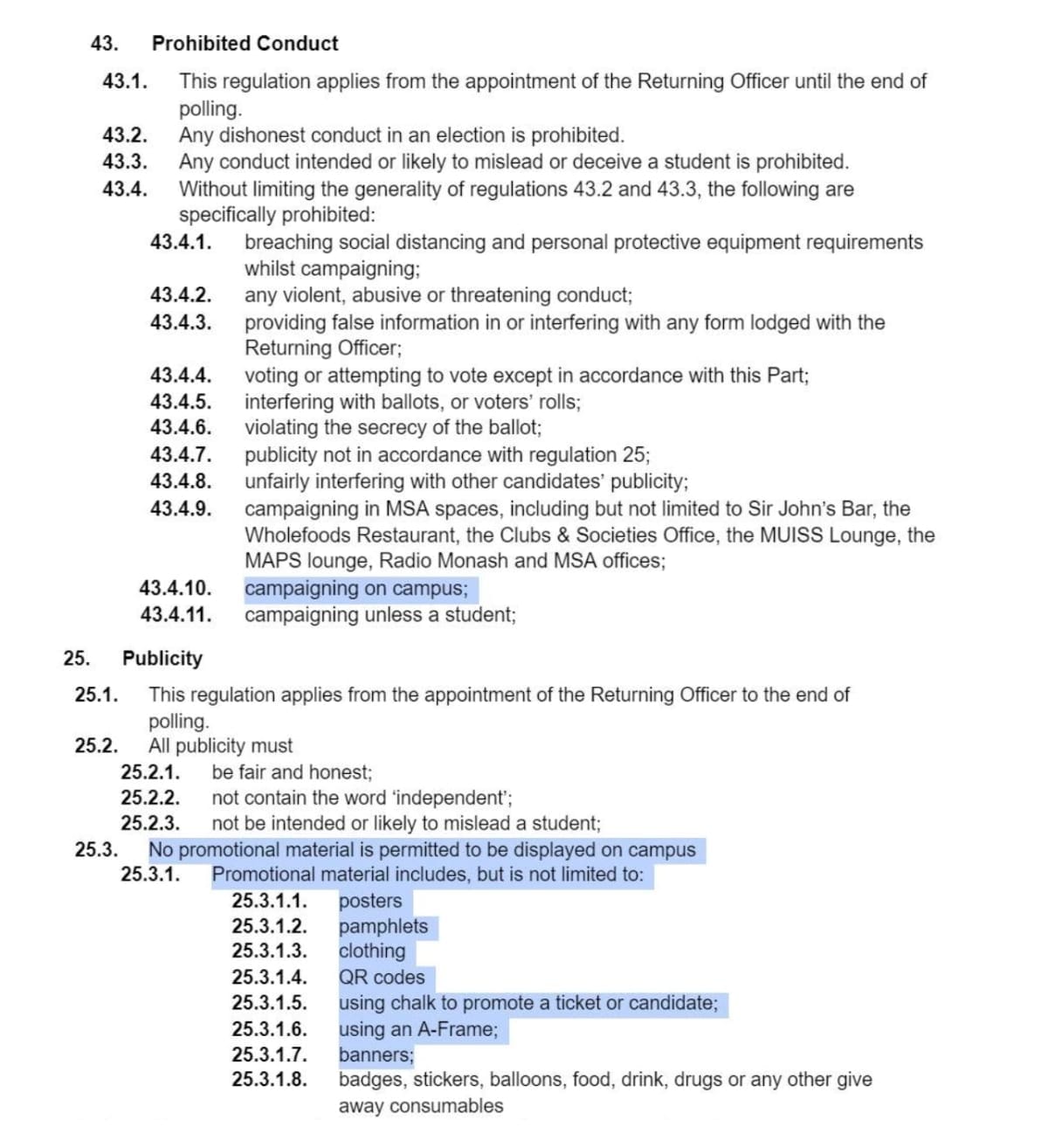The ban prevents students from campaigning on Clayton campus - including all promotional material such as posters, pamphlets, clothing, QR codes, and banners - an online election format is being used instead.