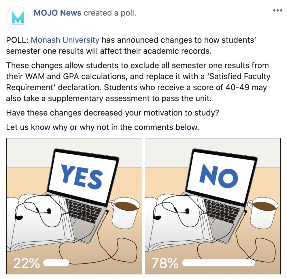 Twenty-two per cent of Monash University students are experiencing a decrease in motivation to study following changes to academic transcripts and supplementary assessments for semester one, according to a MOJO News poll.