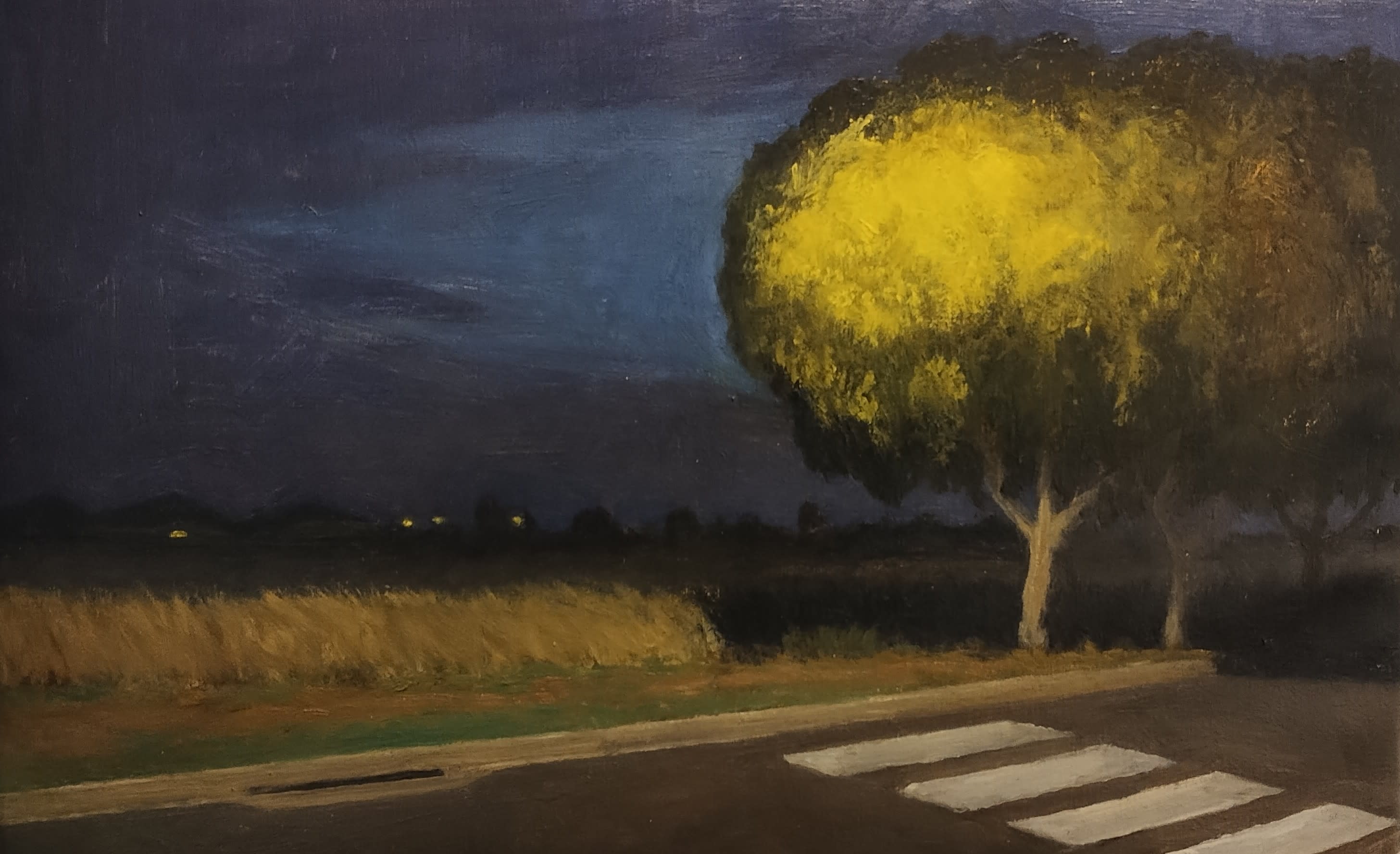 The piece features a grassy plain, which stretches towards houselights that speckle the horizon. A tree is painted with bright, almost acidic limes and viridescent, darkening emerald shades. There are no people, only a street at the forefront with a crossing. Just as with light, there is constant play with presence and absence.