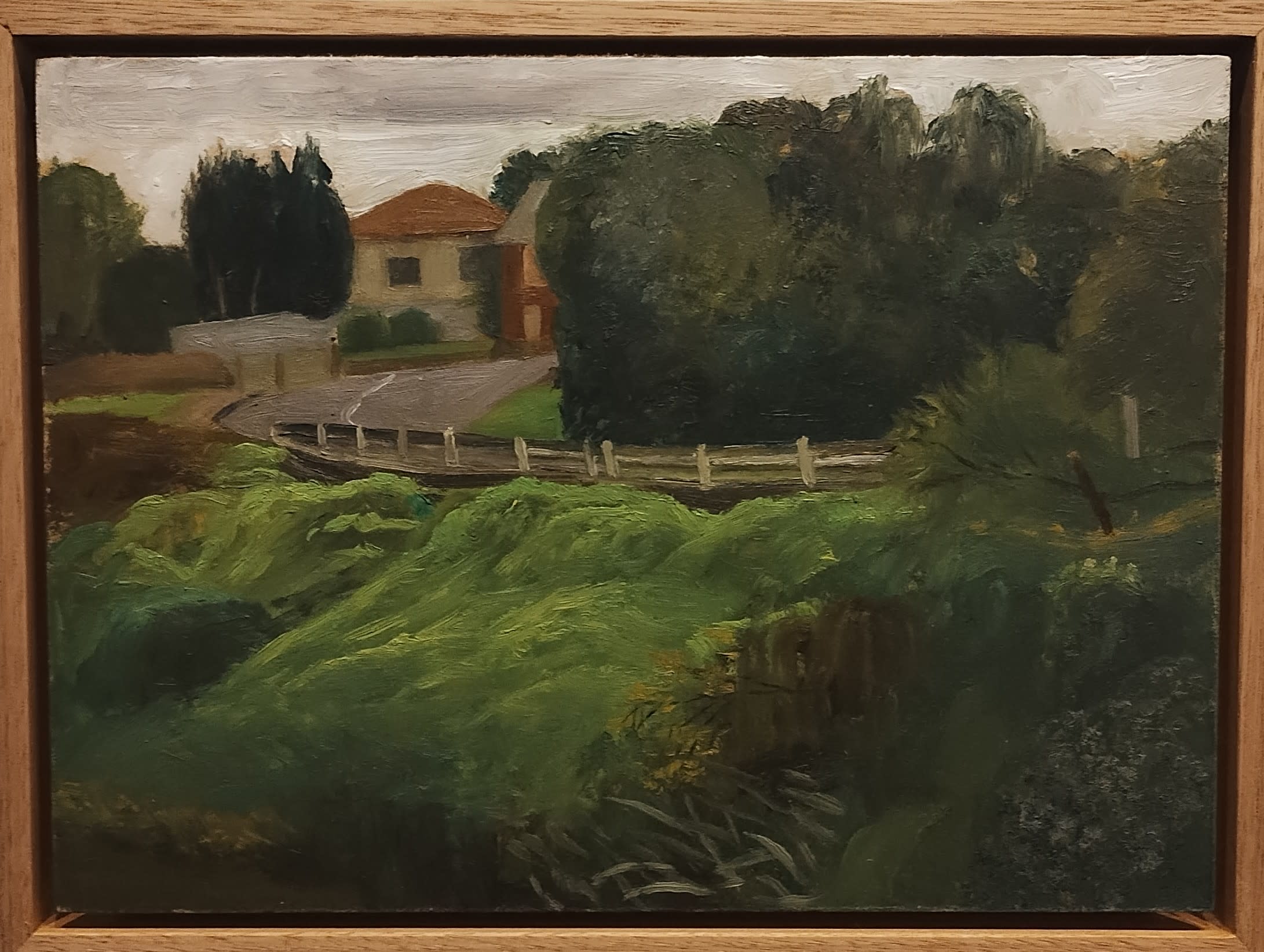 One of the oil paintings — Road over Merri Creek — reveals a shy, quaint house at the bend of a road. Verdant and mossy greens bubble over each other from the road’s edge to the murky creek below. Brushed upon the canvas, a storm brews above, heavy grey clouds balloon and swell in the sky, charging the painting with its restraint over nature that threatens to brim over the pavement and shelter.