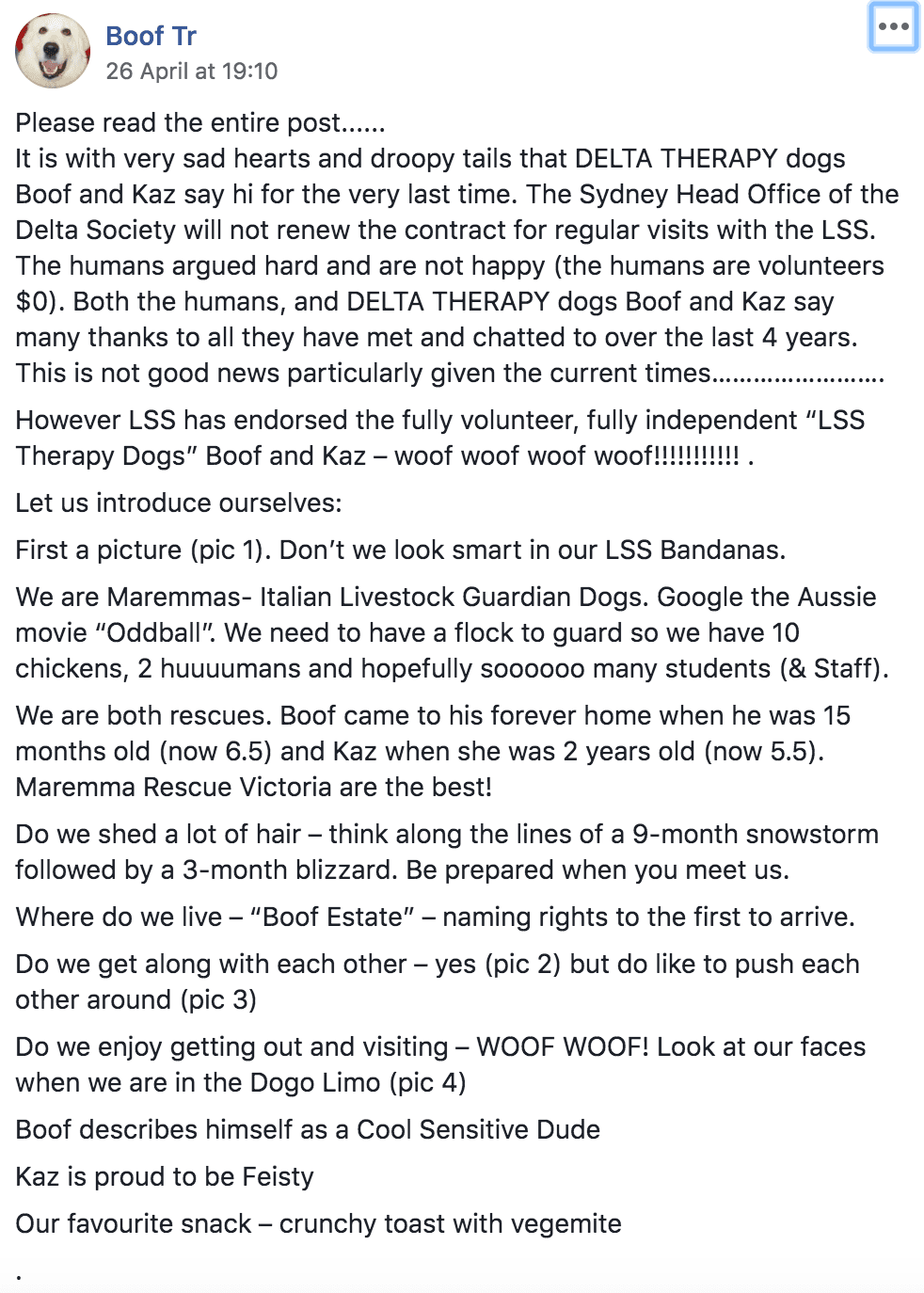 Instead, a direct partnership between LSS and the therapy dog owners, Ian and Mary Tredinnick, was announced on Facebook on April 26, with dog-loving students posting comments of their relief.