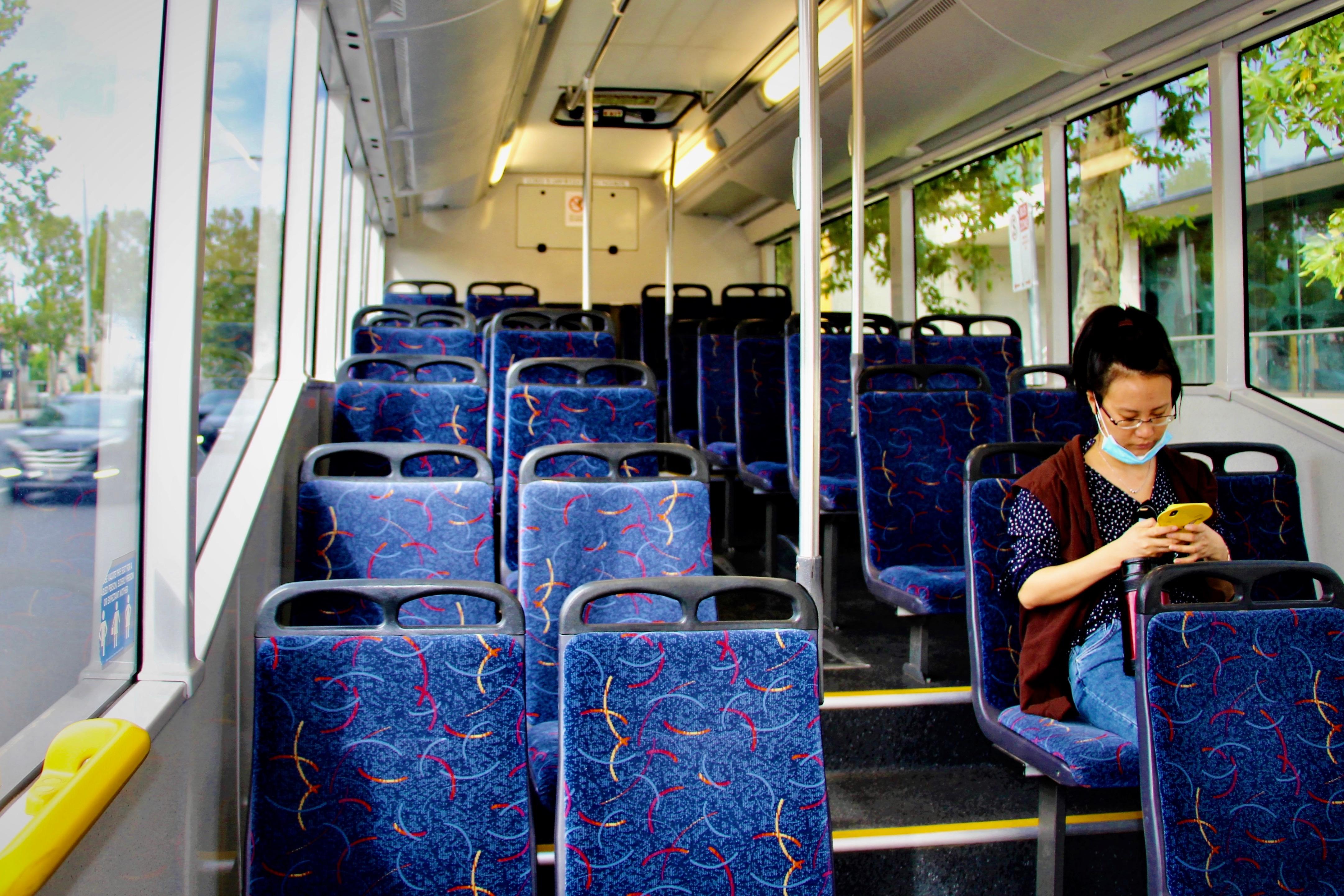 A usually jam-packed shuttle bus between Clayton and Caulfield typically requires passengers to stand as it ferries hundreds of students a day between campuses. Now, a sole passenger rides the bus. Taken April 1, 2020. PHOTO: Dishi Sangani