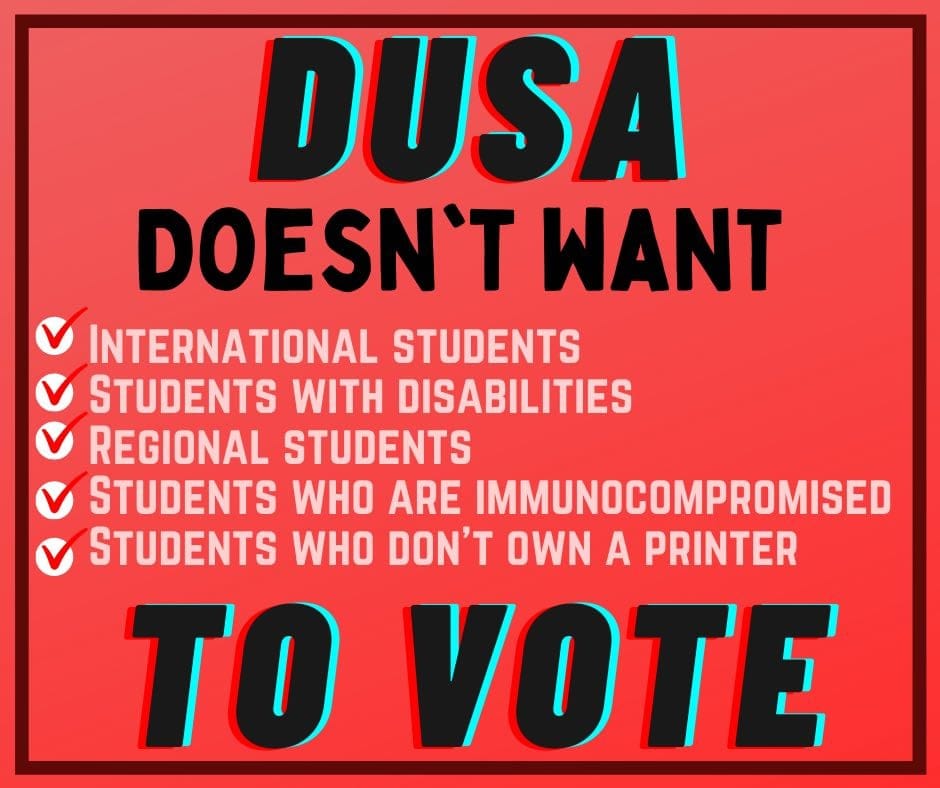“Off the back of government and university health advice, DUSA naturally concluded that its annual election, traditionally held via attendance polling, would need to be held via alternative methods,” Mr Whitten said.