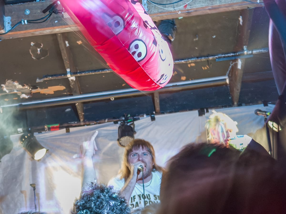 As they jumped on stage, a barrage of inflatable doughnuts hit the concertgoers in the mosh, causing absolute pandemonium. While the band played their set, they ducked and dived around, deflecting the air-filled projectiles launched at them from the chaotic mosh pit.