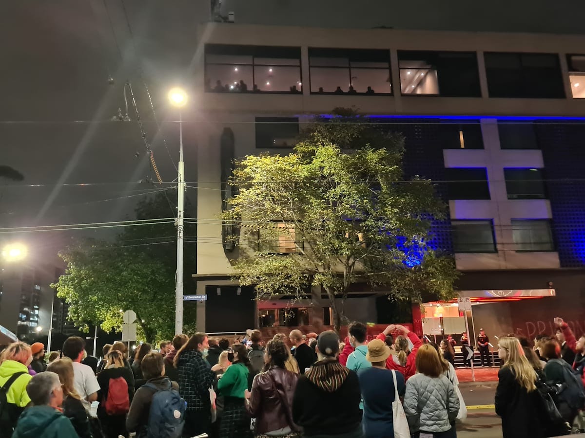 A snap rally of more than 100 activists and refugee supporters took place outside The Park Hotel in Carlton on Monday night, after refugees were forcibly transferred there from Brisbane.