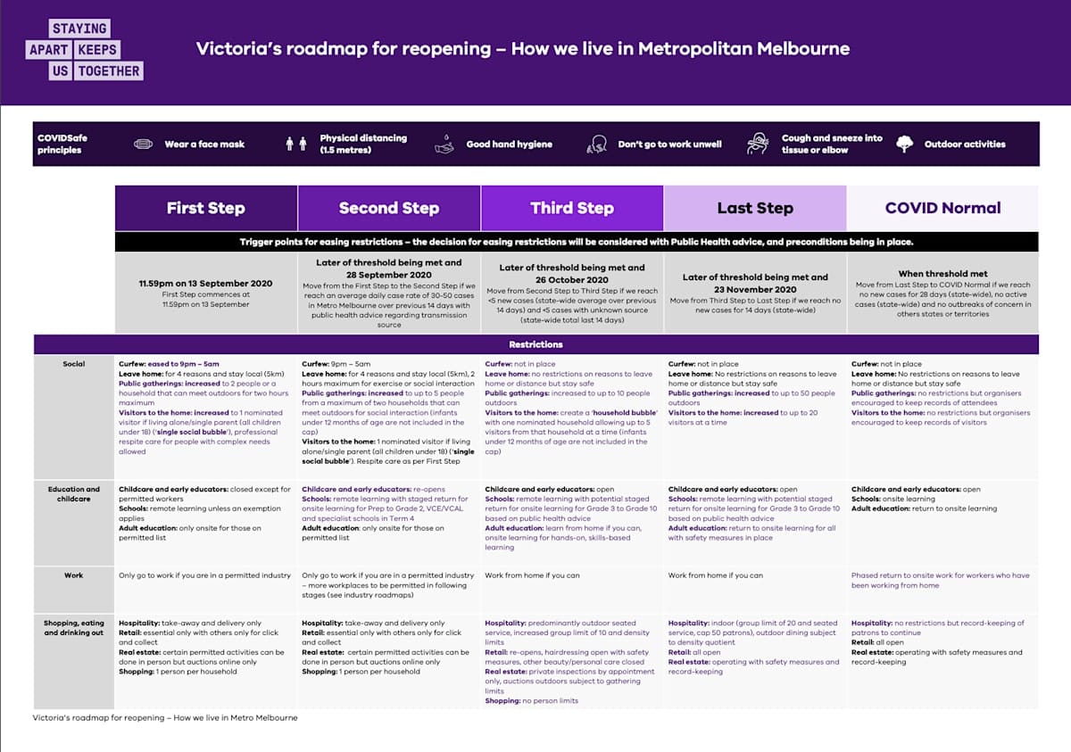 This roadmap states the 9pm-5am curfew should be removed on October 26, with a five kilometre restriction on movement to stay in place until November 23.