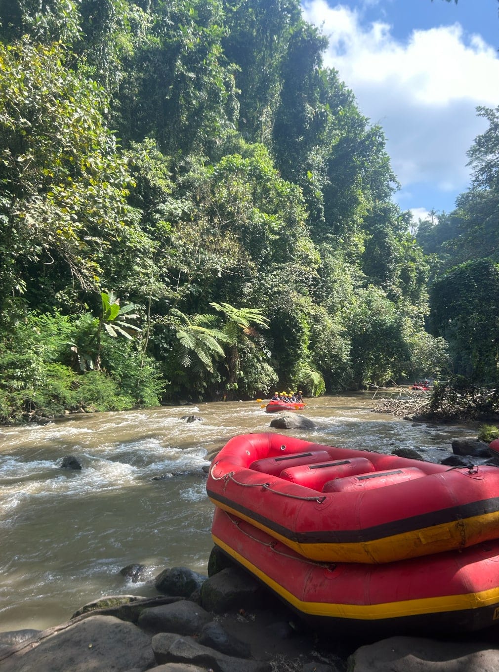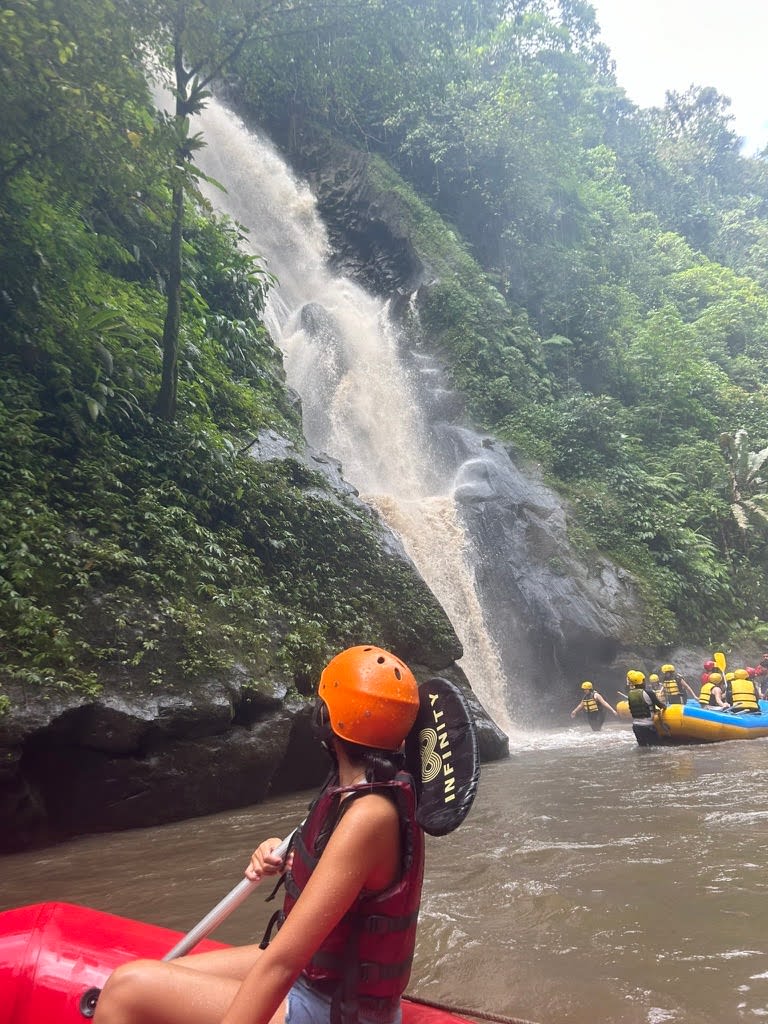 We were each given a paddle to help guide the boat through flowing rapids. As we paddled, lush greenery surrounded us, revealing hidden offering sites, and a gushing waterfall. It gave us a chance to experience the ebbs and flows of nature; a simultaneously peaceful and exciting experience.