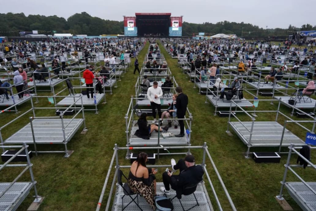 In August, English musician Sam Fender performed a series of socially distanced shows at the Virgin Money Unity Arena in the UK, which housed individual enclosures that could hold up to five fans.