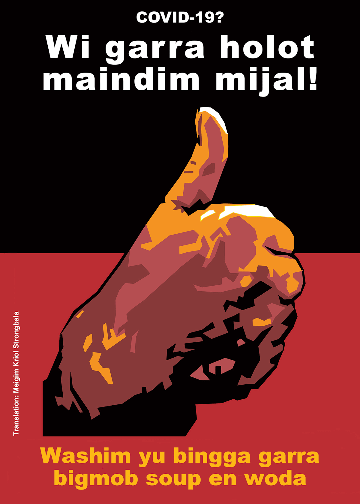 For example, “washim yu bingga garra bigmob soup en woda” is Kriol for “wash your hands with lots of soap and water”.