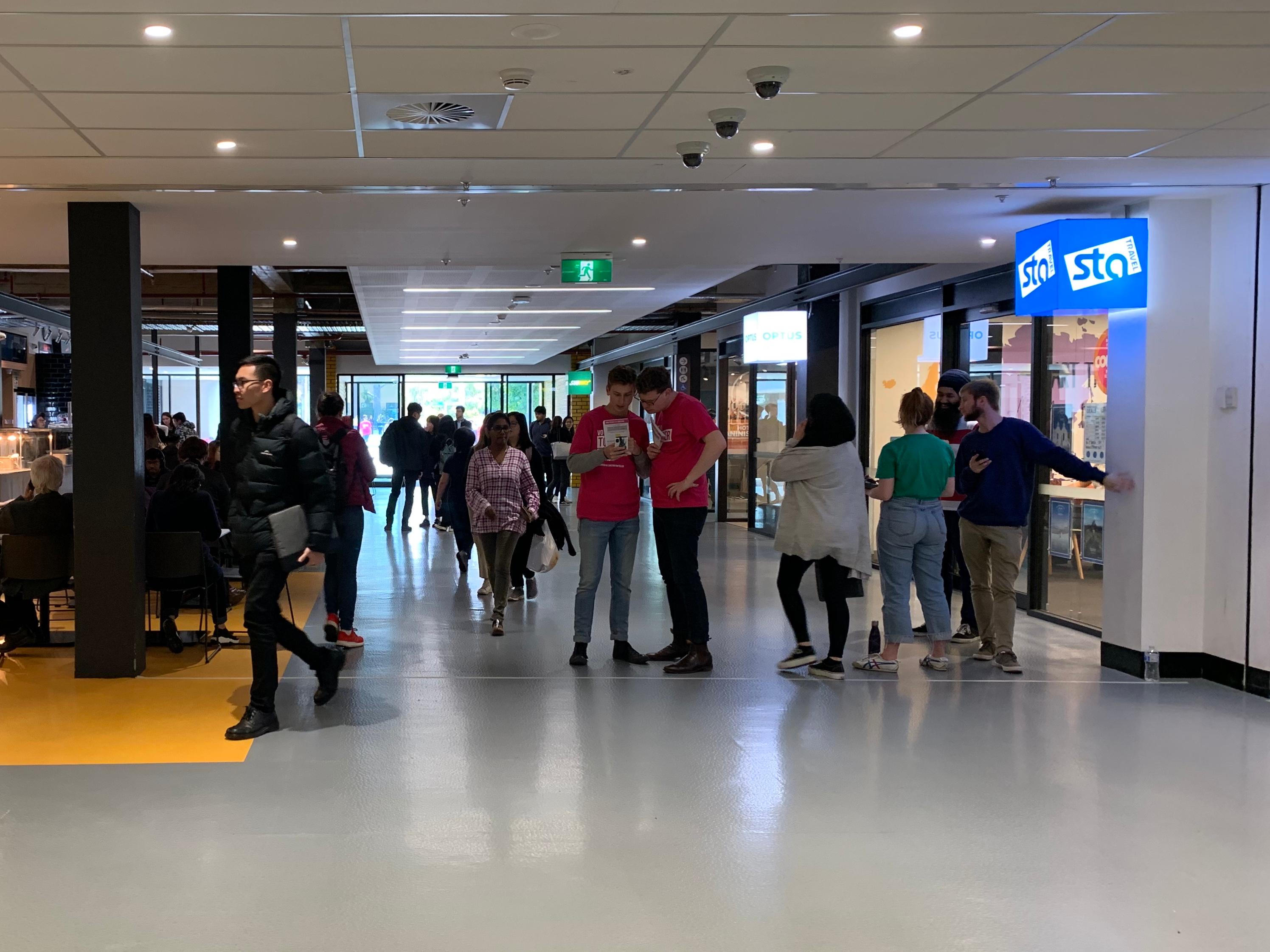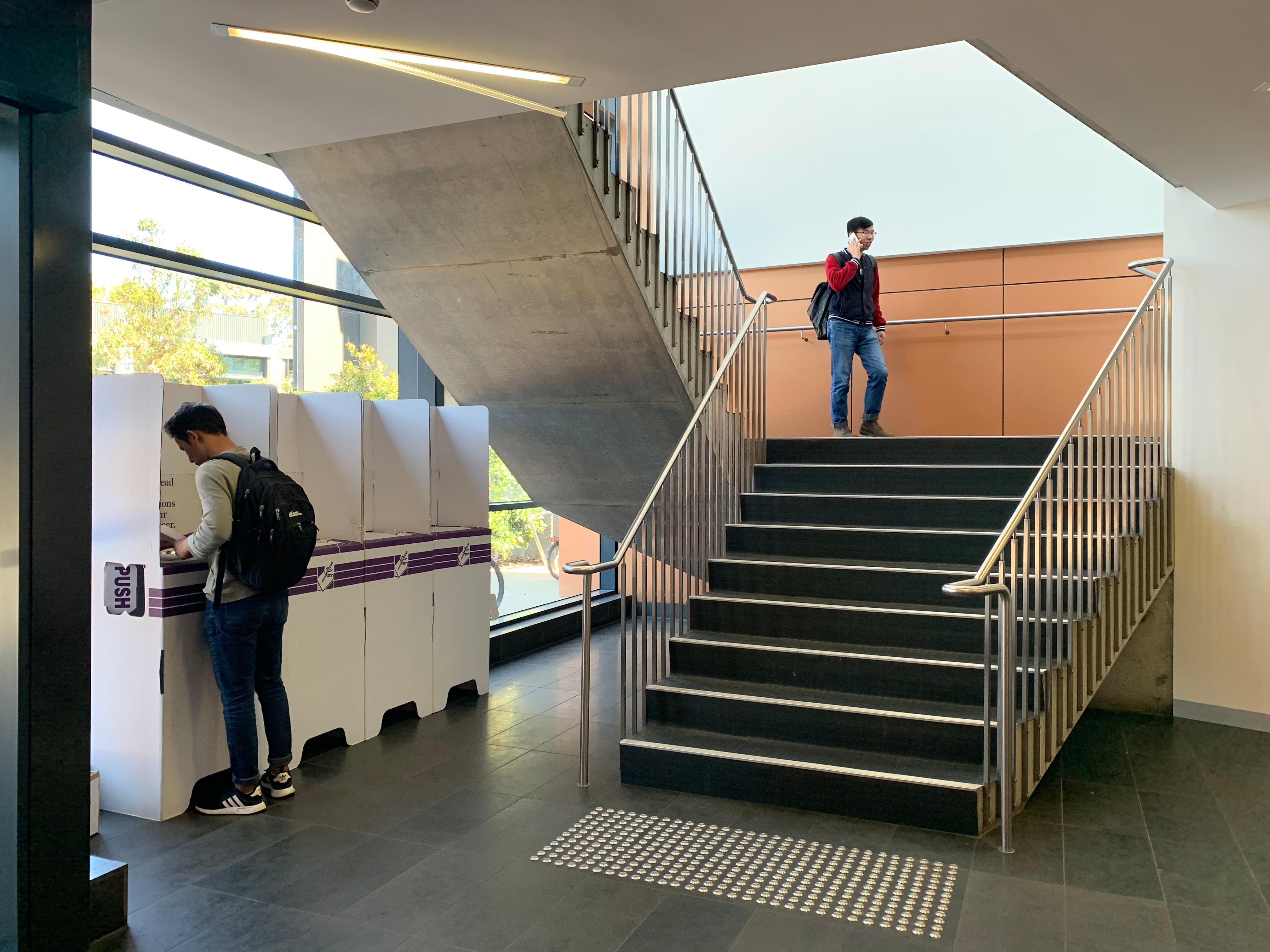 Campaigners were free to approach students outside of the masking tape boundary, with a form of defence the yellow ‘I HAVE VOTED’ sticker handed to voters by polling officials.