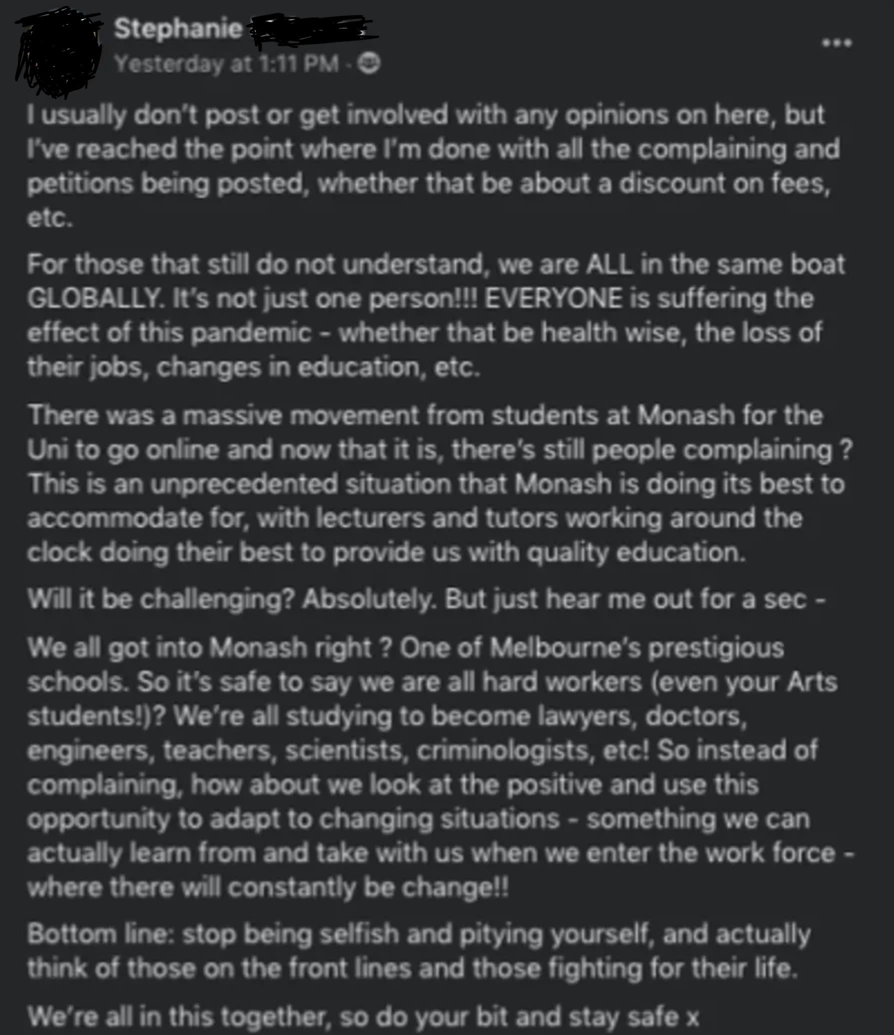 In a post on Monash Stalkerspace, Stephanie wrote she was “done with all the complaining”, emphasising that people need to understand that “we are all in the same boat globally”.