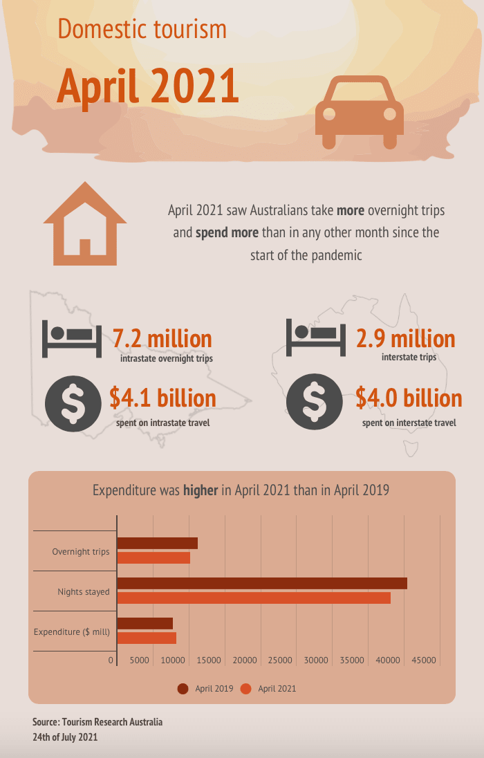 According to Tourism Research Australia, Australians spent almost double the money in regional areas compared to capital cities in April 2021.