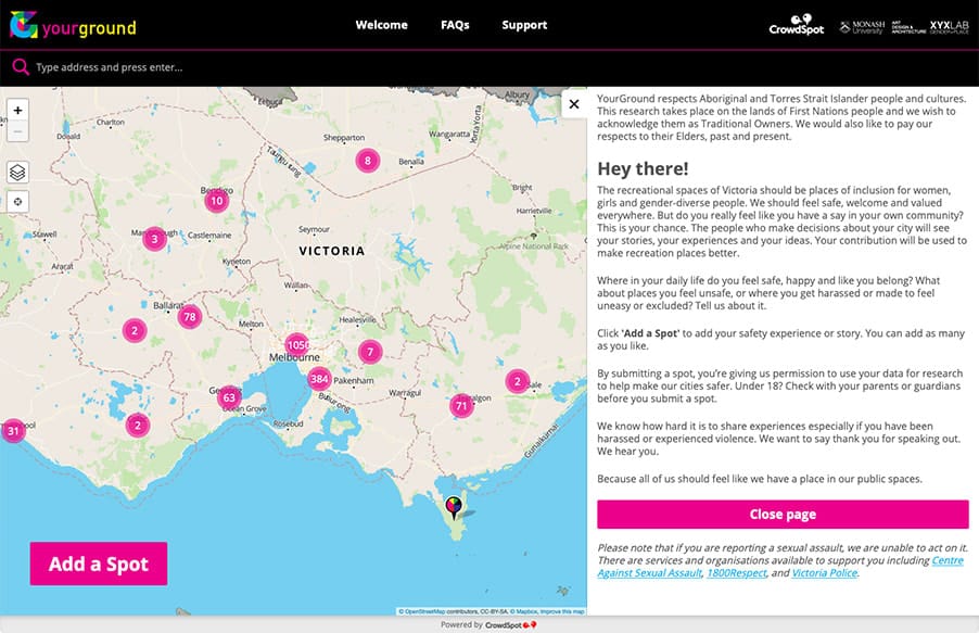 YourGround is an initiative created by Monash University’s XYX Lab in partnership with CrowdSpot. It allows people to anonymously identify ‘Unsafe Spots’ and ‘Safe Spots’ in Victoria based on their lived experiences.